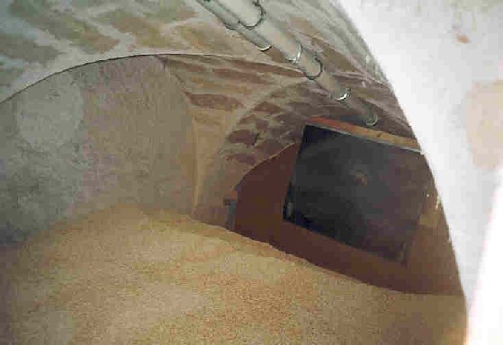 Brennstoffbunker: Im Gewölbekeller untergebrachte Schubbodeneinheit mit Trogförderschnecken, Lagervolumen in der ersten Ausbaustufe 80 m3